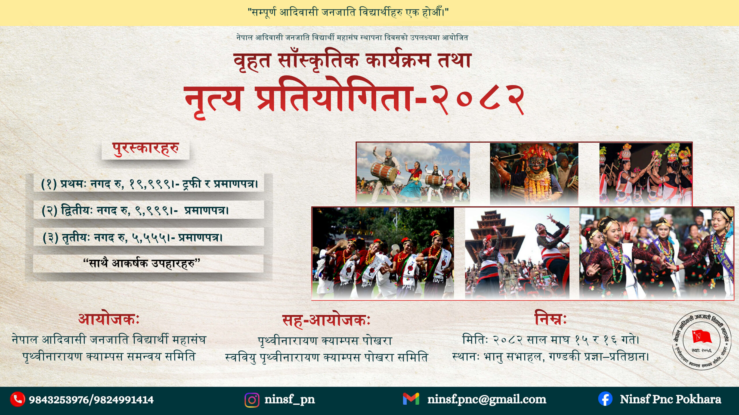 पोखरा, नेपाल आदिवासी जनजाती विद्यार्थी महासंघ, पृथ्वी नारायण क्याम्पस समन्वय समितीद्वारा आगामी माघ १५ र १६ गते “वृहत साँस्कृतिक कार्यक्रम तथा नृत्य प्रतियोगिता–२०८२” भव्य रूपमा सञ्चालन हुने भएको छ। गण्डकी प्रज्ञा प्रतिष्ठान अन्तर्गतको भानु सभाहलमा हुने उक्त कार्यक्रम महासंघको स्थापना दिवसको उपलक्ष्यमा आयोजना गरिएको कुरा नेपाल आदिवासी जनजाती विद्यार्थी महासंघ, पृथ्वी नारायण क्याम्पस समन्वय समितीका अध्यक्ष रबिन्द्र कुमार श्रेष्ठले जानकारी दिएका छन।